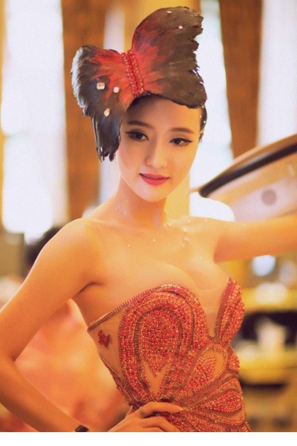 吴雨蝉身着一袭红色深V礼服,优雅侧身展现完美曲线